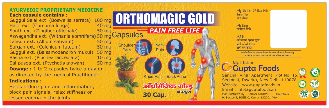 Gupta Foods presents a 100% ayurvedic medicine for joint pain and knee pain. Formulated with highly researched and proven herbs, Orthomagic Gold ensures to reduce inflammation, pain, swelling, redness and stiffness. It is useful for even chronic joint pain.
